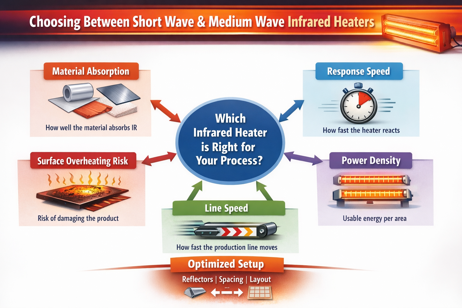 For most industrial buyers, the decision narrows to five variables: material absorption, response speed, surface overheating risk, line speed, and usable power density. That is the correct comparison frame, because infrared performance depends on how much radiation the target actually absorbs, how quickly the heater can react, and whether the delivered energy can be applied inside the available distance and dwell-time window. Reflectors, spacing, and layout then determine how much of that theoretical advantage reaches the product in practice.